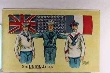 Lot #1106. View Larger | Rotate W.W. I, U.S. Pub., “Six Union Jacks”, Used 1917 DB cor wear Near F-VF