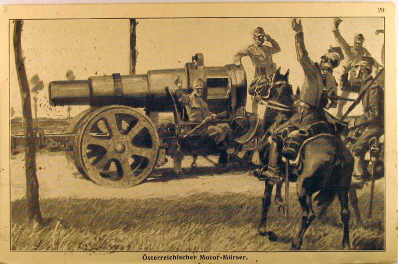 Lot #1147. View Larger | Rotate W.W. I Austrian pub. Kriegspostkarte, “Osterreichischer Motor - Morser”, Art. Sig., B&W, used DB m cof F