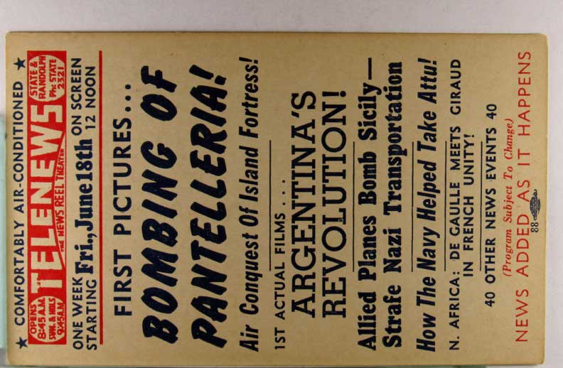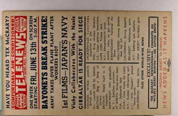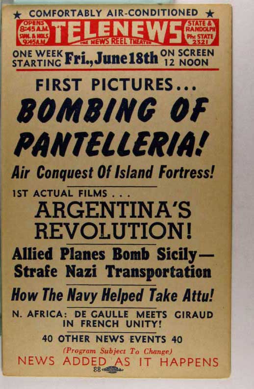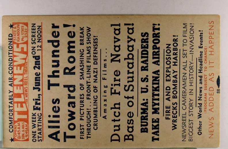 Lot #1158. View Larger | Rotate W.W. II, U.S. Pub., War News Reel Chicago, Theater Adv., “Telenews”, Fri., Apr. 25th VF