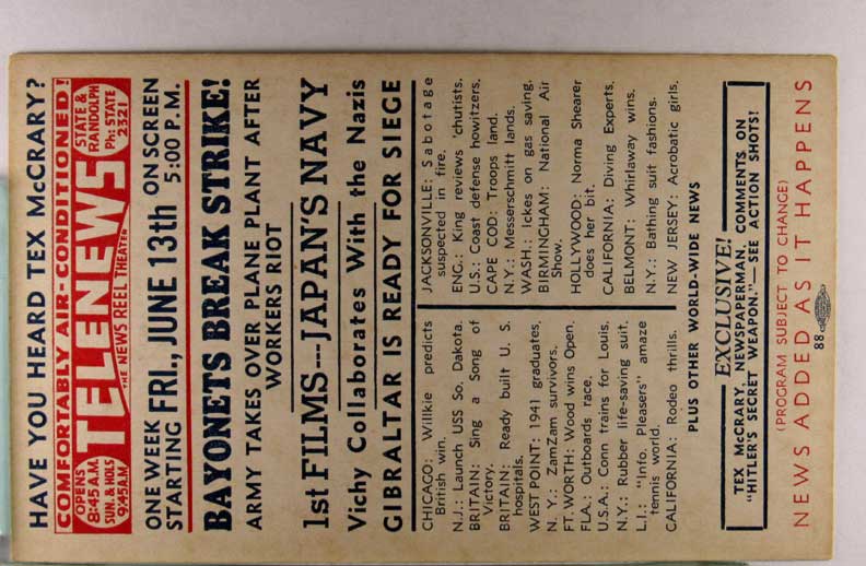 Lot #1159. View Larger | Rotate W.W. II, U.S. Pub., War News Reel Chicago, Theater Adv., “Telenews”, Fri., Jan. 16th VF