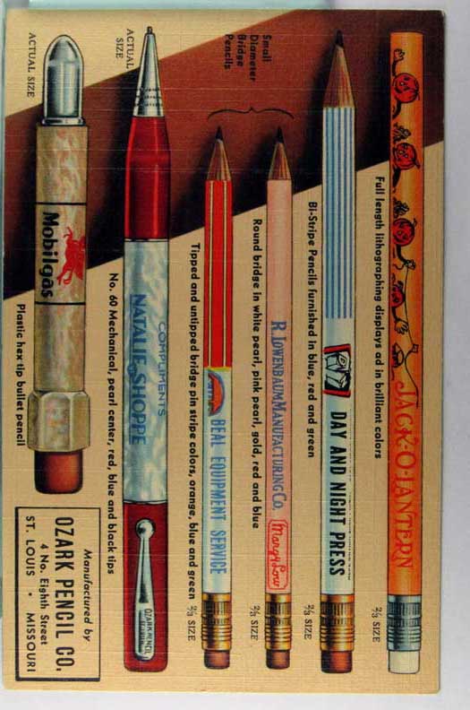 Card # 183389. View Larger | Rotate Adv. Ozark Pencil Co., St. Louis, Missouri, Curt Teich Pub., Incl. Halloween & Mobilgas Themed Pencils, Great! L VF