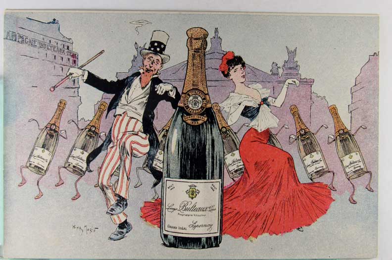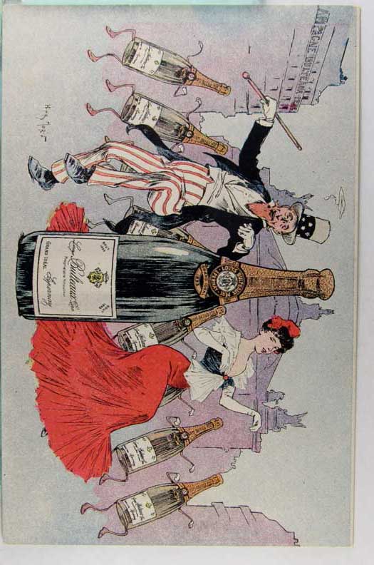 Card # 158614. View Larger | Rotate Adv. Bulteaux Champagne, Art. Sig. Henri Morin, Great w/ Uncle Sam & Fantasy Dancing Bottles, French Pub. UB VF