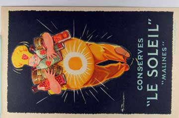 Card # 160579. View Larger | Rotate Poster Card Adv. Conserves Le Soleil Malines, French Pub., Art. Sig. VF