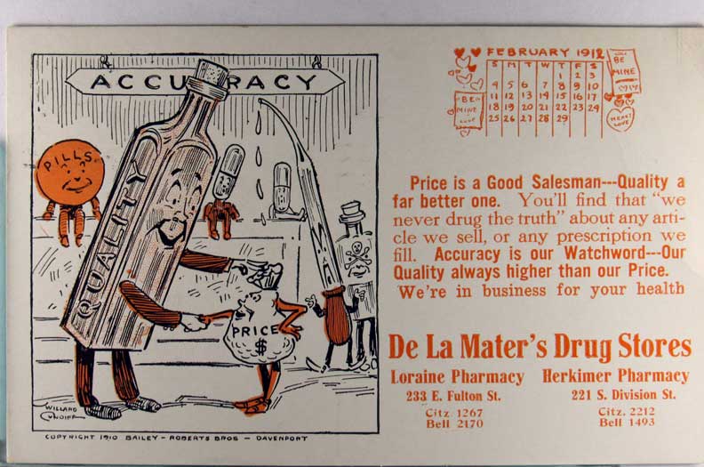 Card # 194919. View Larger | Rotate Adv. De La Mater’s Drug Stores, w/ Fantasy Medicine, Incl. 1912 Calendar, Used Same DB m cor cr F-VF