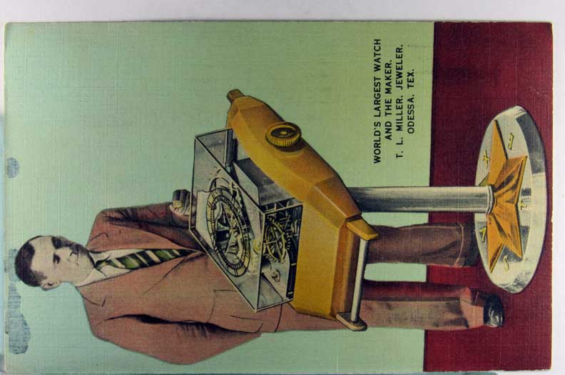 Card # 194996. View Larger | Rotate Adv. T.L. Miller Jeweler, Odessa, Texas, w/ World’s Largest Watch, Used 1940 L edge st Near VF