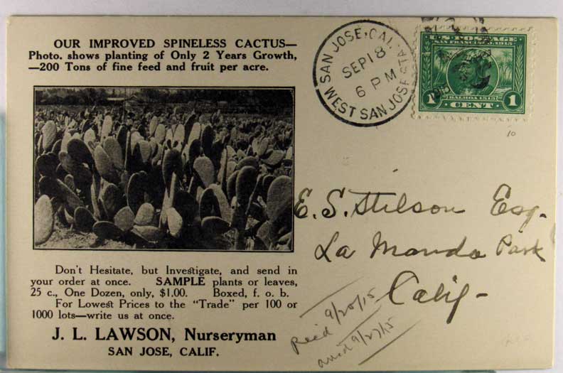 Card # 195008. View Larger | Rotate Adv. Cactus Nursery, San Jose, California, Used Same 1915 DB VF