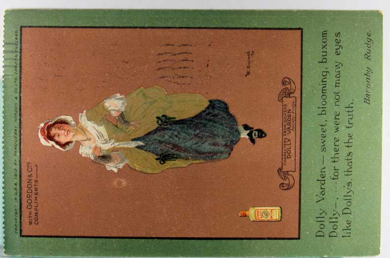 Card # 195203. View Larger | Rotate Adv. Gordon’s Dry Gin, Dicken’s Barnaby Rudge Related, used 1914 m cof F-VF