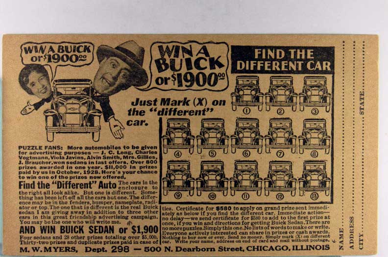 Card # 195316. View Larger | Rotate Adv. M.W. Myers Car Dealership, Chicago, Illinois, “Win A Buick or $1900” m cor cr Near VF