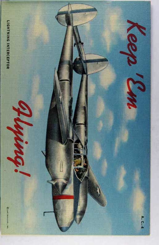 Card # 185683. View Larger | Rotate W.W. II, Keep ‘Em Flying Ser., Curt Teich Pub., “Lightning Interceptor” L VF