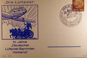 Card # 20323. View Larger | Rotate German Special Event on 3 pf. Gov’t Postal Card, 10 Year Deutscher Luftpost - Sammler - Verband, CTO 1937 w/ Event Cancel VF