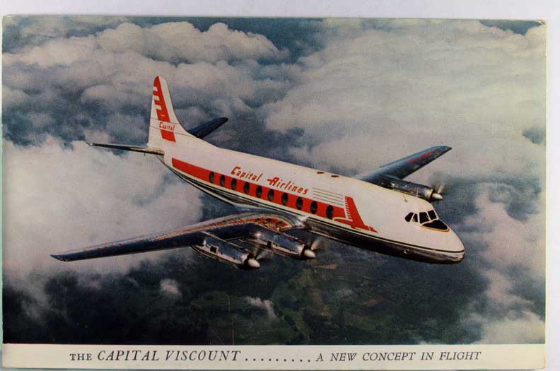 Card # 48051. View Larger | Rotate Adv. Capital Airlines, Viscount, Used 1955 w/ 4¢ Airmail Issue C VF