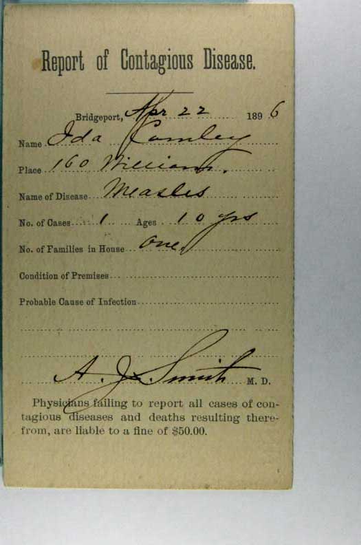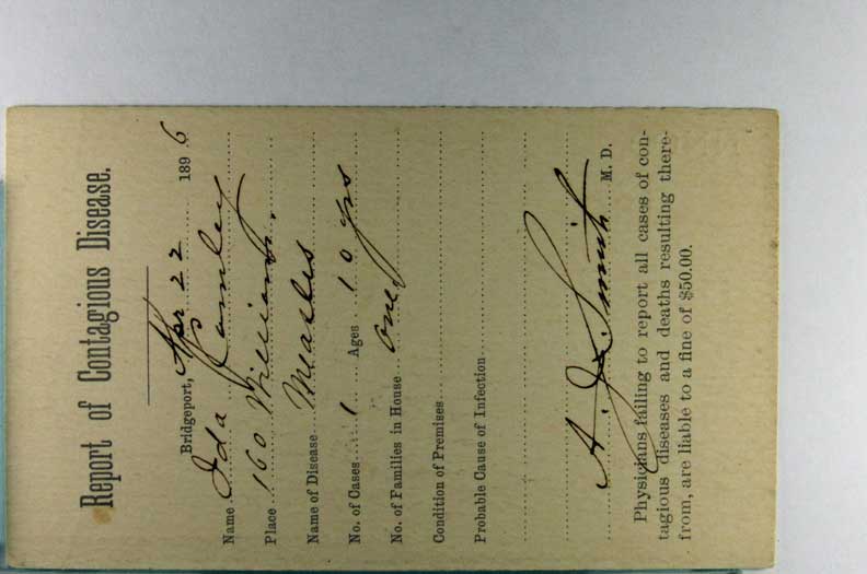 Card # 195715. View Larger | Rotate Report of Contagious Disease on U.S. Gov’t Postal, Dated 1896 w/ Measles Listed, Used Bridgeport, Connecticut VF