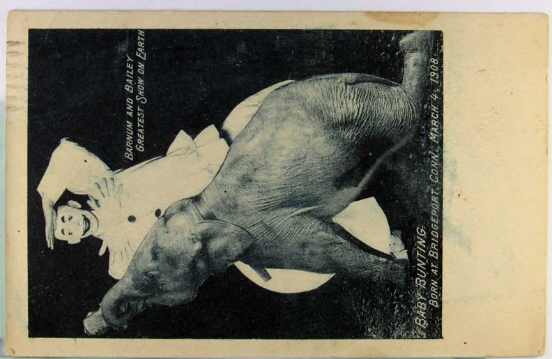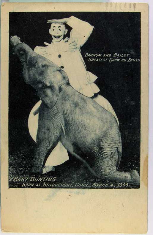 Card # 186103. View Larger | Rotate Adv. Barnum & Bailey Circus, Photogravure, Clown w/ Baby Elephant, “Baby Bunting”, Used 1908 m cof & m cor wear F-VF
