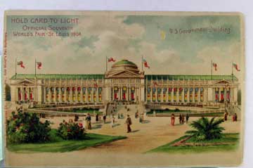 Card # 157448. View Larger | Rotate 1904 St. Louis Expo., Novelty Hold to the Light, Die-Cut, U.S. Gov’t Bld., Cupples Pub. major cr F