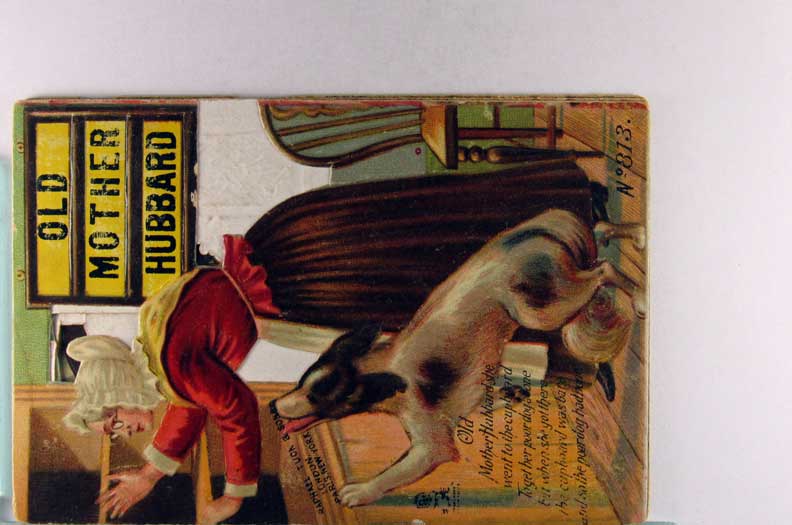 Card # 197336. View Larger | Rotate Nursery Rhyme, Die-Cut Booklet w/ Non P.C. back, R. Tuck Pub., “Old Mother Hubbard”, w/ Fantasy Animals m wear F-VF