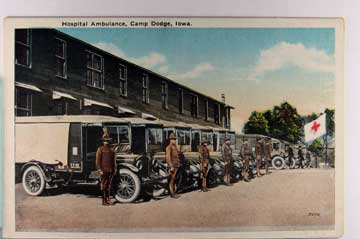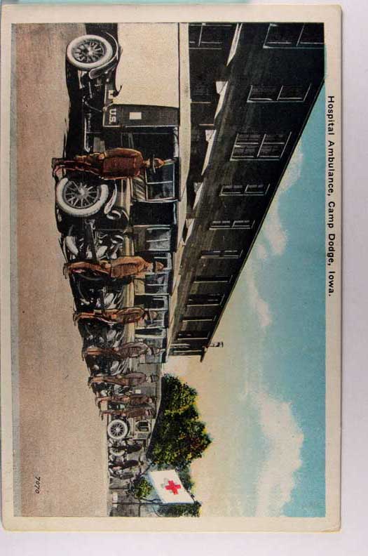 Card # 196423. View Larger | Rotate U.S. Military, Camp Dodge, Iowa, “Hospital Ambulance”, Tinted Printed Photo WB m cor wear F-VF