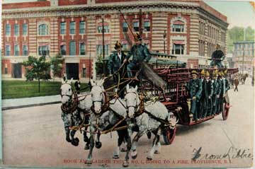 Card # 168616. View Larger | Rotate Firefighting, Horse-Pulled Hook & Ladder Truck, Providence, Rhode Island, Tinted Photogravure DB VF