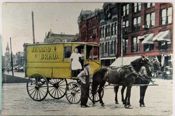 Card # 195007. View Larger | Rotate Horse-Drawn Wagon Adv. Jerkins Bread, Tinted Printed Photo, Used 1908 DB cor wear F-VF