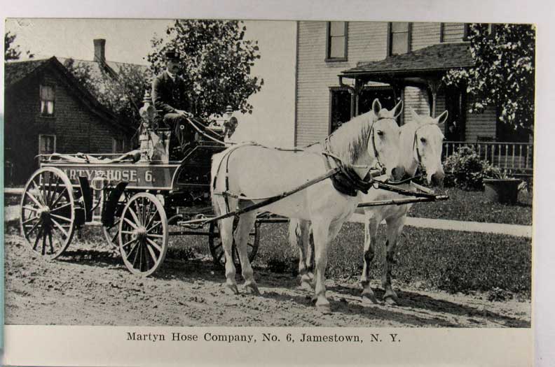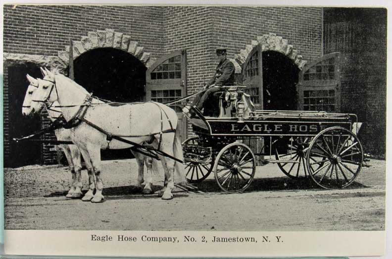 Card # 171489. View Larger | Rotate Horse-Drawn Hose Truck, “Eagle Hose Co.”, Jamestown, New York, Printed Photo UB VF