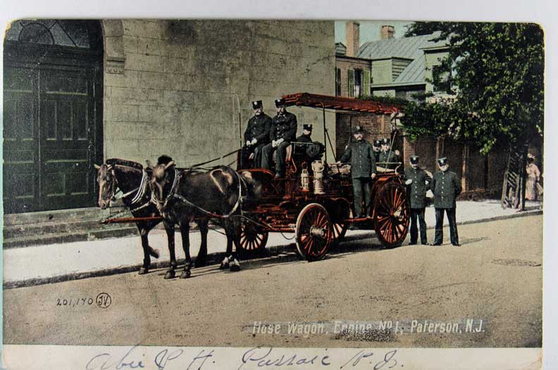Card # 181671. View Larger | Rotate Horse-Drawn Fire Wagon, Tinted Printed Photo, Paterson, New Jersey, Used 1907 UB cor wear & pwof F