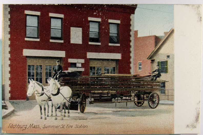 Card # 171450. View Larger | Rotate Horse-Drawn Fire Wagon, Fitchburg, Massachusetts, Tinted Printed Photo UB m flts Near F-VF