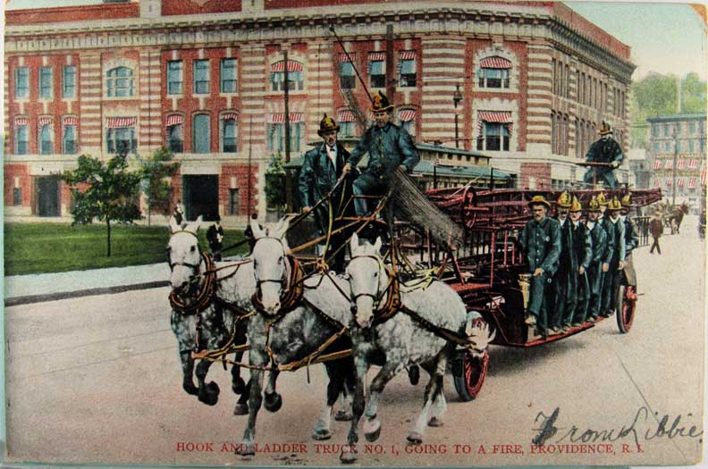 Card # 171474. View Larger | Rotate Horse-Drawn Hook & Ladder Truck, Providence, Rhode Island, Tinted Printed, Used Same 1907 DB m wof & m cor wear F-VF