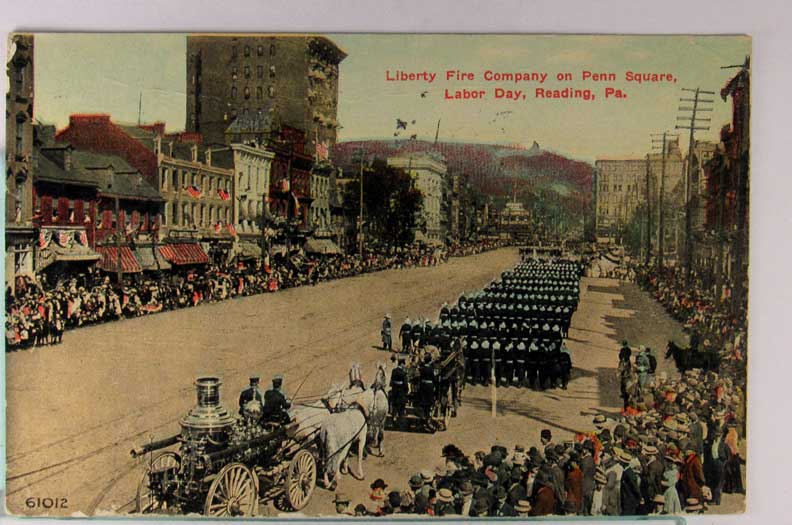 Card # 182387. View Larger | Rotate Horse-Drawn Fire Engine, “Liberty Fire Company”, Reading, Pennsylvania, Tinted Printed Photo DB m cor cr Near VF