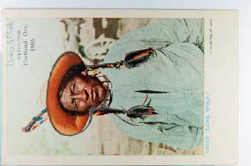 Card # 195616. View Larger | Rotate Chief Lone Wolf, Tinted Printed Photo, 1905 Lewis & Clark Expo. UB tinsel VF