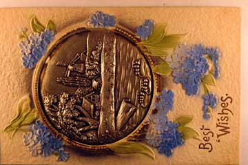 Card # 70051. View Larger | Rotate Novelty Heavily Embossed Gold Painted Celluloid (?) Scene, “Best Wishes” DB emb VF