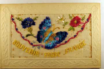 Card # 61697. View Larger | Rotate French Embroidered Silk w/ Butterfly, W.W. I era, “Souvenir From France” DB m tone F-VF