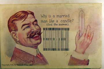 Card # 78190. View Larger | Rotate Novelty Elongated Secret Message, Turn Card to Read, “Why is a Married Man Like a Candle?” UB crs Near F-VF