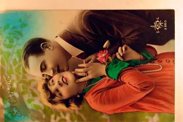 Card # 16634. View Larger | Rotate French Tinted Photo, DEDE #289, Couple Kissing in Leaf VF