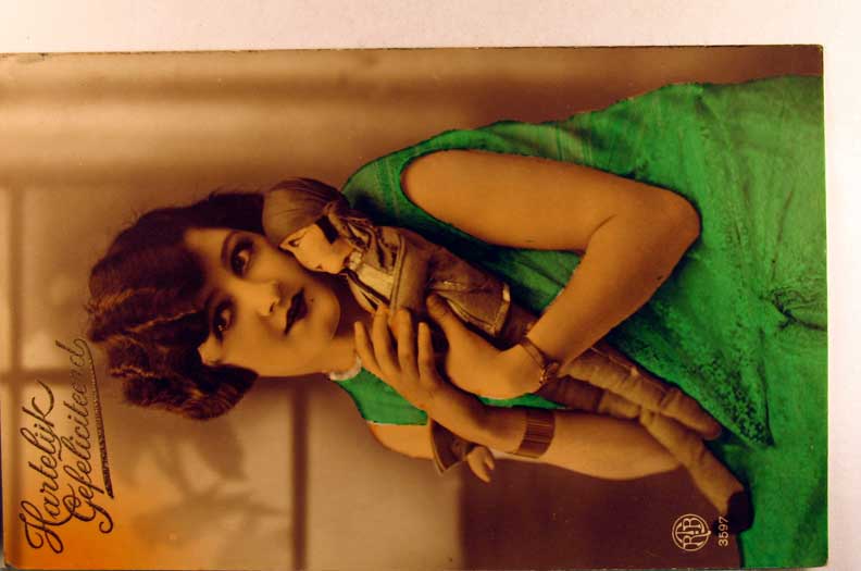 Card # 66466. View Larger | Rotate Woman w/ Doll, Tinted Real Photo, RTB #3597, Used 1934 VF