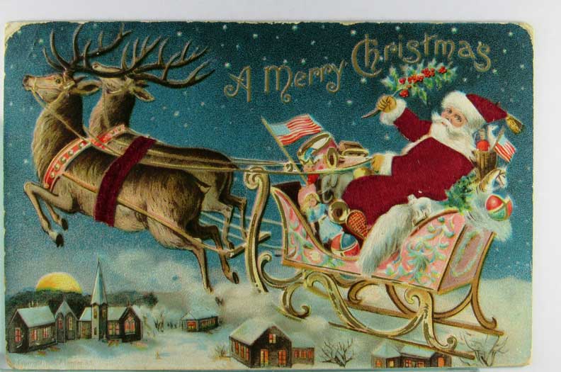 Card # 110197. View Larger | Rotate Red Suited Santa w/ Reindeer & Gold Ink, Whitney Pub. DB emb VF