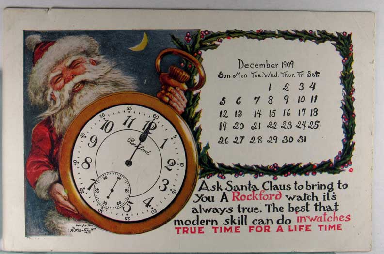Card # 163610. View Larger | Rotate Adv. Rockford Watch, Art. Sig. R. F. Outcault, Dec. 1909 Calendar ser. w/ Santa, Great Card m edge nicks Near VF