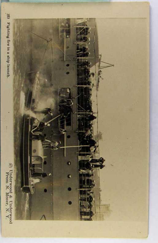 Card # 185450. View Larger | Rotate U.S. Military Ship, Real Photo, Underwood Pub., “Fighting Fire in Ship Launch” cor cr Near VF