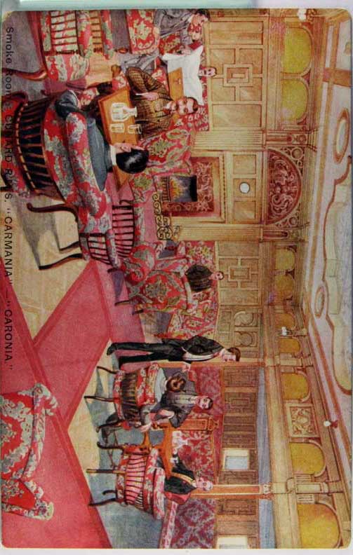Card # 186816. View Larger | Rotate Adv. Cunard RMS Carmania, Interior View of “Smoke Room” DB m cor wear Near VF