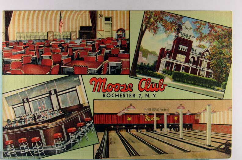 Card # 196791. View Larger | Rotate Bowling, Adv. Moose Club, Rochester, New York, Curt Teich Pub. L VF