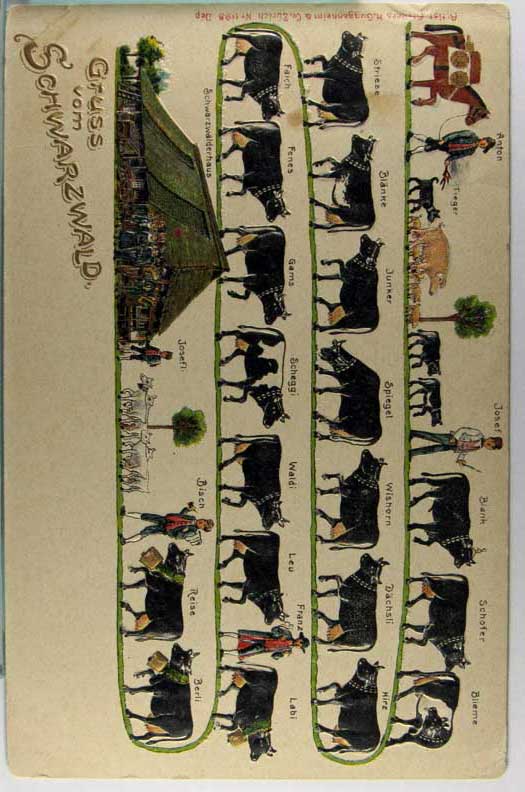 Card # 195428. View Larger | Rotate Winder, Gruss vom Schwarzwald w/ Cows, Used 1908 DB emb cor crs Near F-VF