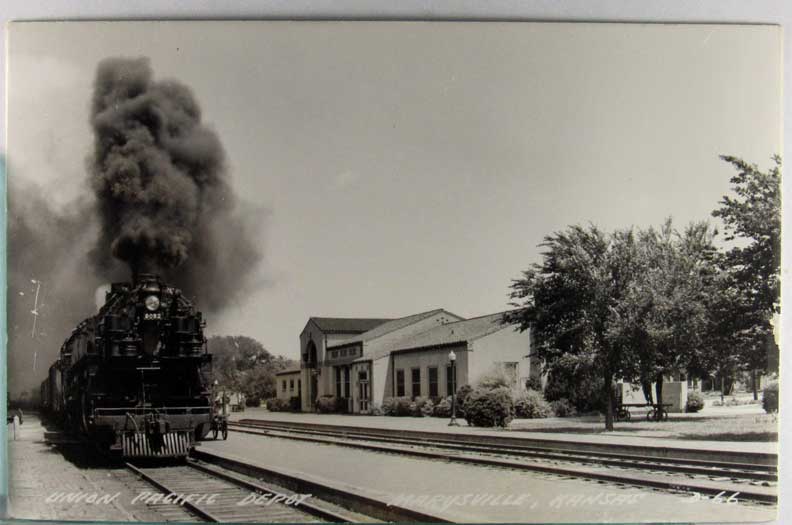 Card # 194843. View Larger | Rotate Union Pacific Depot, Marysville, Kansas, Real Photo Kind P.C. back m cor cr Near VF