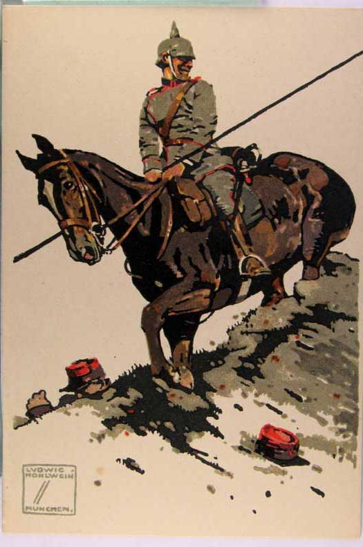 Card # 72095. View Larger | Rotate W.W. I German Red Cross Wohlfahrtskarte, Cavalry, used 1916 w/ Feldpost Usage some paper on face F-VF