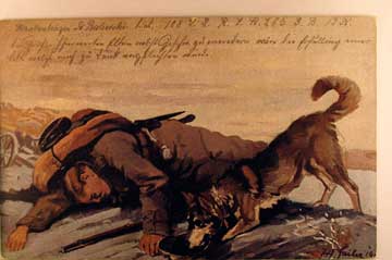 Card # 46993. View Larger | Rotate W.W. I German Wohlfahrts Postkarte, Art. Sig. w/ Wounded Soldier and Medical Dog, used 1916 w/ Feldpost and Purple Marking wof F-VF