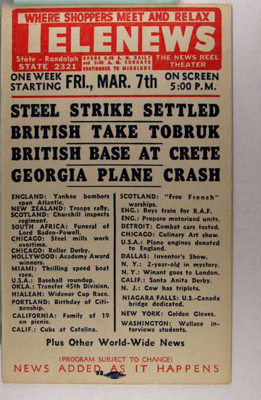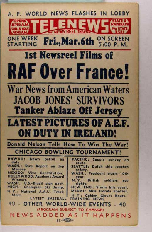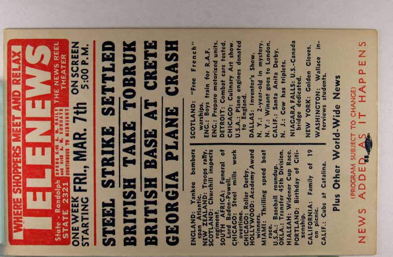 Card # 187707. View Larger | Rotate W.W. II, U.S. Pub., War News Reel Chicago, Theater Adv., “Telenews”, Fri., Mar. 21st VF