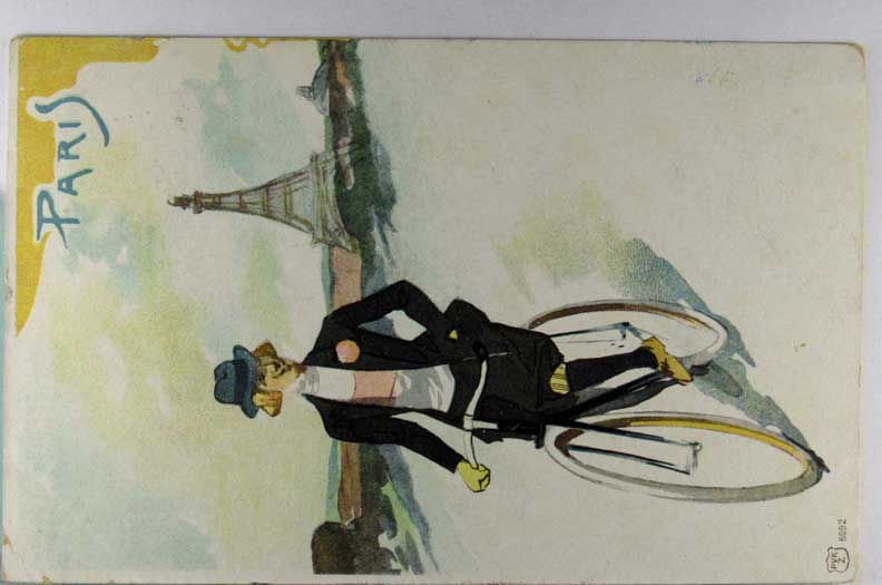 Lot #133. View Larger | Rotate French Pub. Art Card, Bicycles and Riders of Different Lands Ser., #6092, “Paris”, Art. Sig. UB m cor album marks & m cor cr F-VF