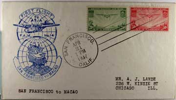 Lot #1225. View Larger | Rotate Cover, Pacific Clipper First Flight Cover, April 21, 1937, San Francisco to Macao VF