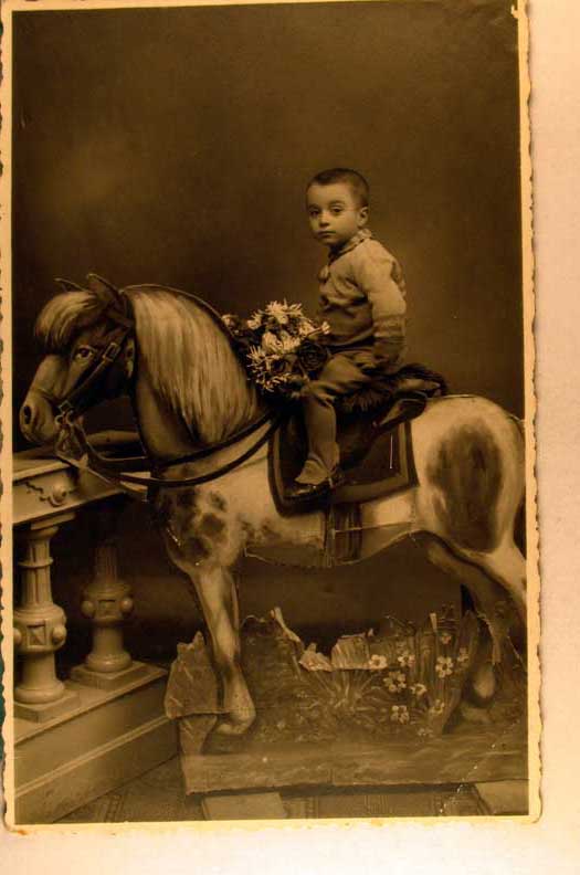 Lot #372. View Larger | Rotate B&W photo, Young Boy on Studio Prop Pony DB cor cr near VF