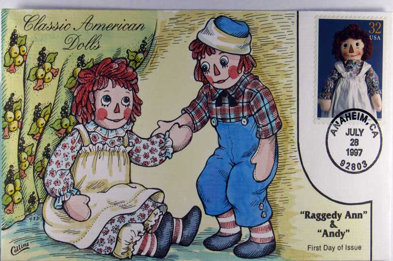Lot #377. View Larger | Rotate Hand-Painted First Day Cover by Collins, Classic American Dolls, “Raggedy Ann & Andy”, 1997 VF