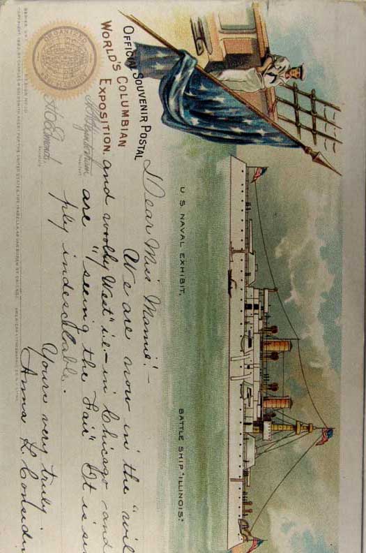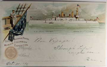 Lot #393. View Larger | Rotate 1893 Columbian Expo., Goldsmith Ser. on Gov’t Postal, Battle Ship Illinois, Used w/ Expo. Station Cancel on Last Day of Fair w/ Message from Exhibitor p wof VF