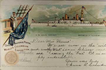 Lot #395. View Larger | Rotate 1893 Columbian Expo., Goldsmith ser. on U.S. Gov’t Postal Card # UX 10, U.S. Naval Exhibit, Battle Ship Illinois m flts Near F-VF