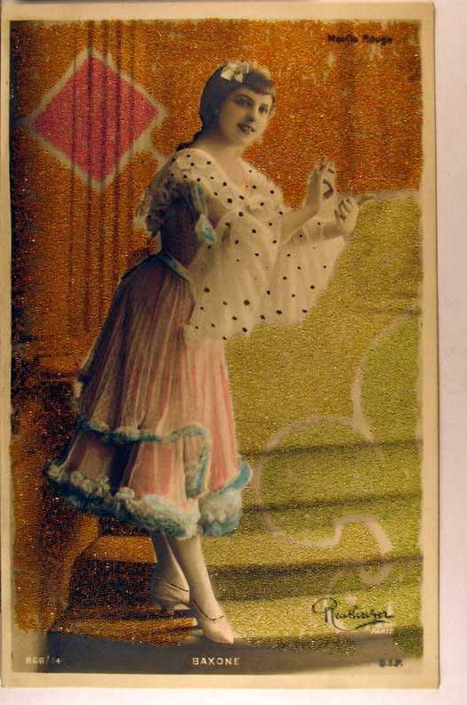 Lot #473. View Larger | Rotate Baxone, French Tinted photo by Reutlinger, S.I.P. # 866 / 14, “Moulin Rouge” ser. w/ Novelty Tiny Beads Added, Beautiful Card UB VF